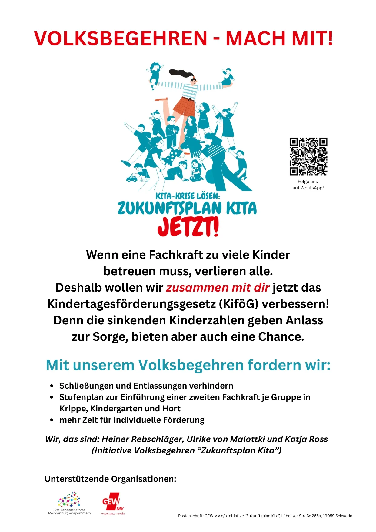 Mit dem Volksbegehren soll erreicht werden, dass mehr Fachkräfte in den Krippen, Kitas und Horten des Landes beschäftigt werden müssen. Dieses Volksbegehren wird vom Kita-Landeselternrat Mecklenburg-Vorpommern (Kita-LER M-V) und der Gewerkschaft Erziehung und Wissenschaft Mecklenburg-Vorpommern (GEW MV) unterstützt. Die Initiative richtet sich an das Land und fordert, noch in dieser Wahlperiode das Kindertagesförderungsgesetz so zu verändern, dass in Stufen nach und nach der Personalschlüssel für die Gruppen verbessert wird. Diesen Stufenplan nennen die Initiatoren „Zukunftsplan Kita“.